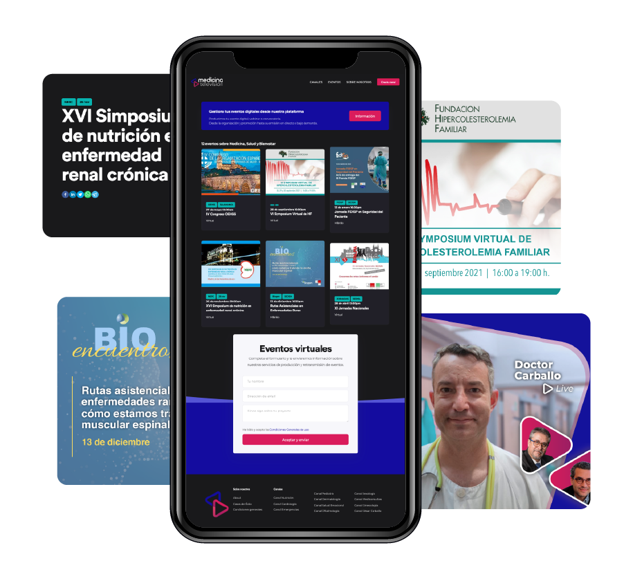 Medicina Televisión es un entorno basado en el rigor científico, el mejor lugar para ampliar tu audiencia. Encuentra con nosotros un espacio seguro para promocionar y emitir tus eventos, webinars o convocatorias sobre salud. Sin esfuerzo, en directo o bajo demanda: tú decides.